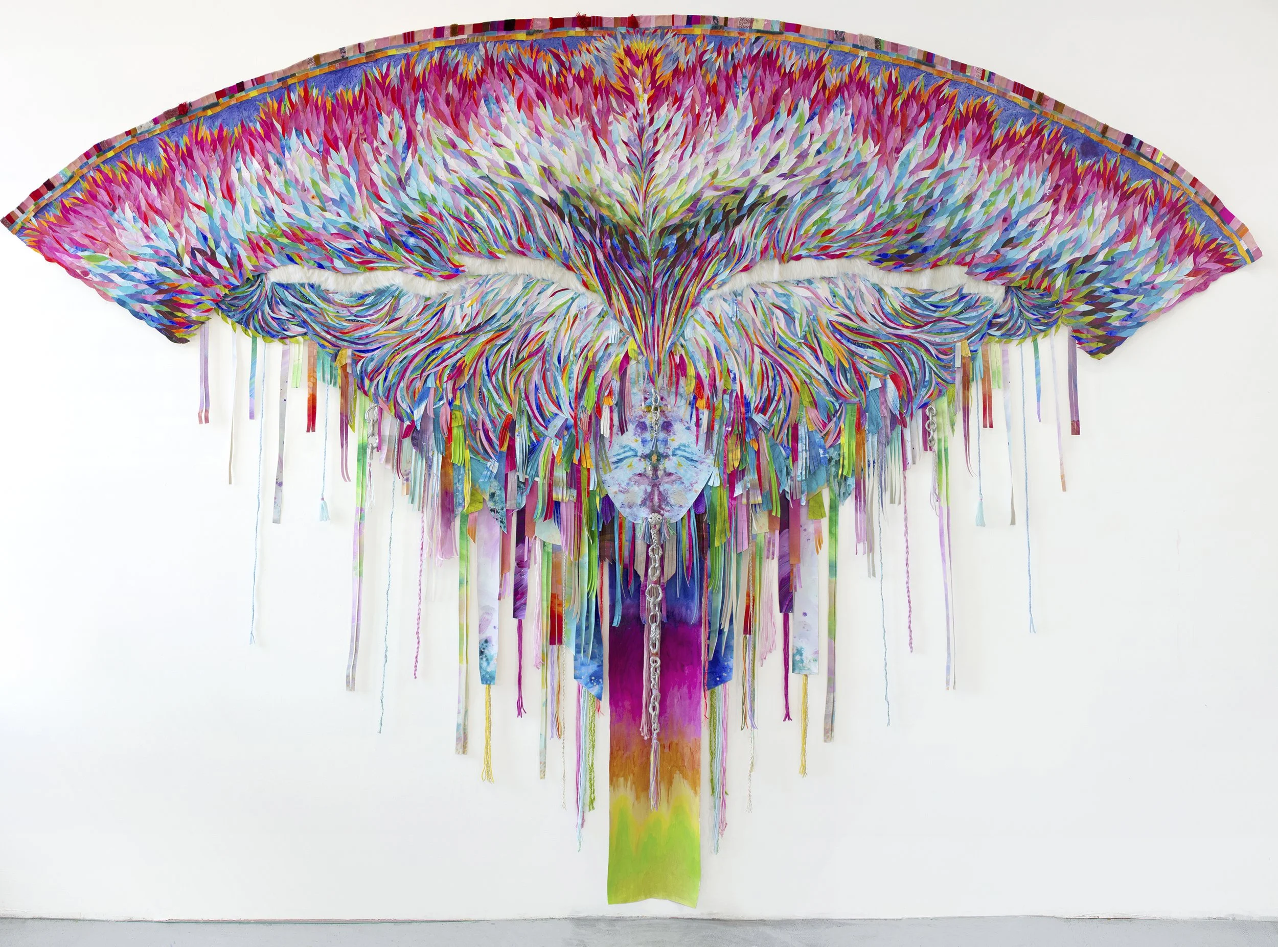 A Bridge, A Chorus, 2020, acrylic and mixed media collage on canvas, faux fur, yarn, handmade ceramic chain, 97” x 140” x 2”