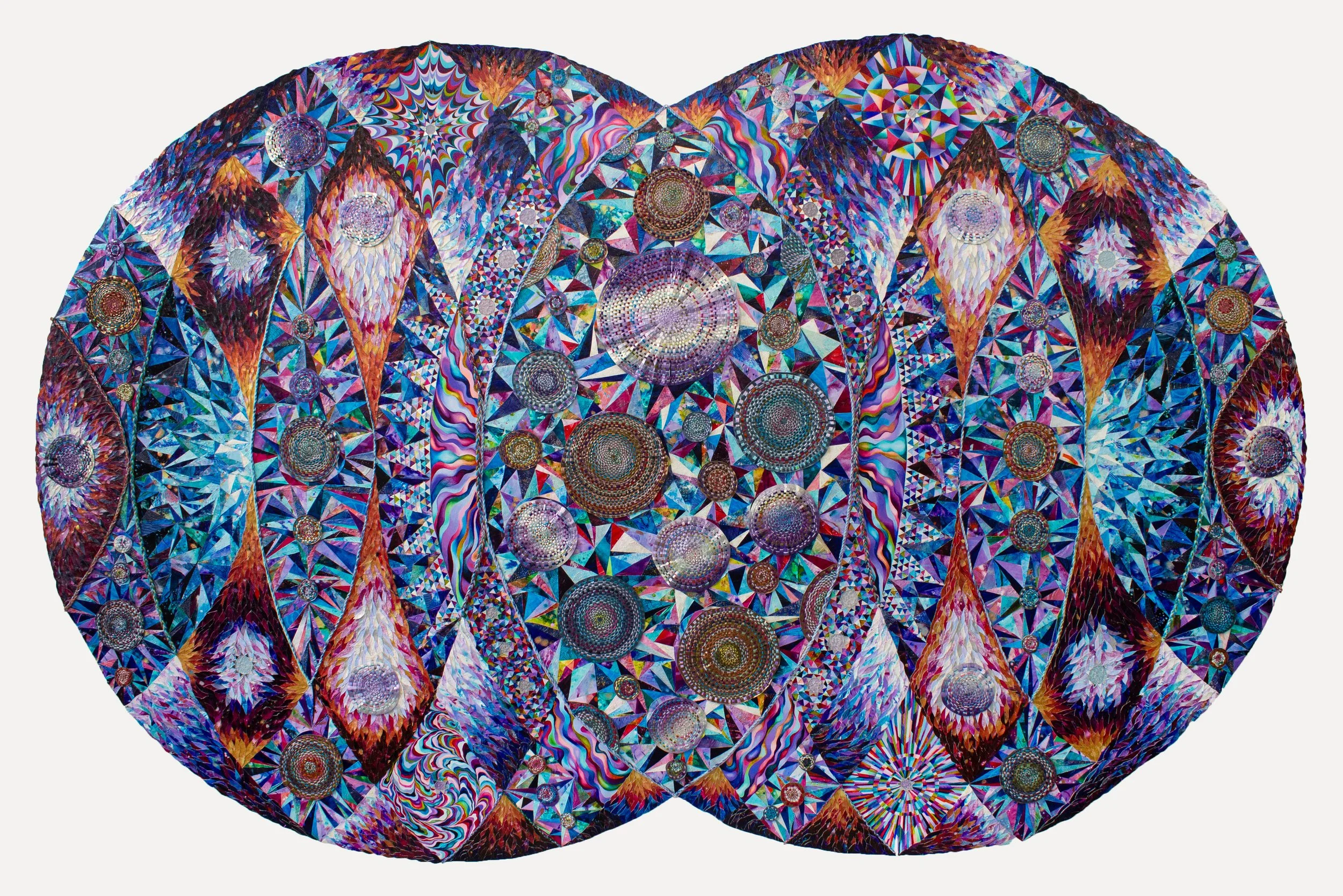 Double Tondo, 2023, acrylic on canvas collage, yarn on recycled fabric weavings, recycled leather, mirrors, and mixed media painting on canvas, 80" x 120"